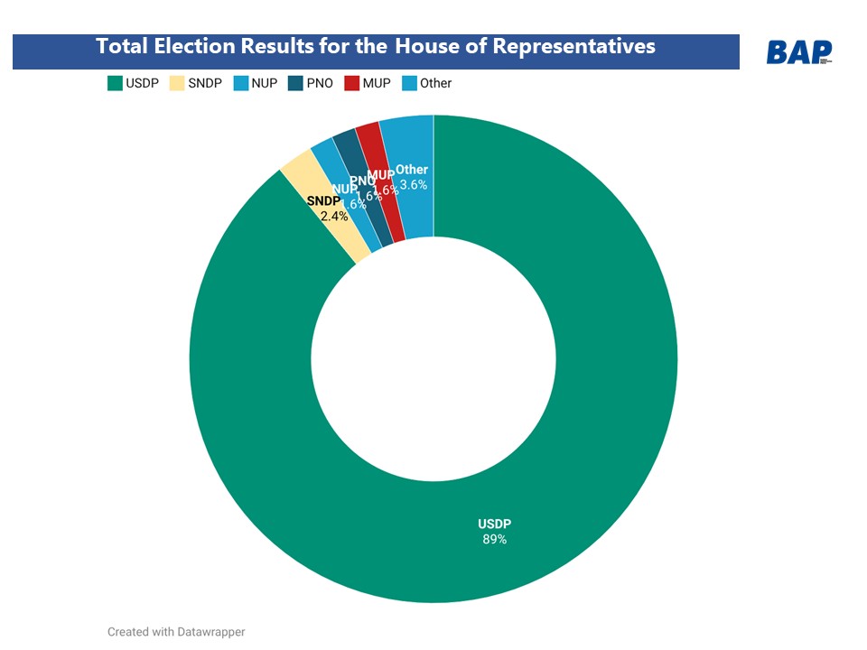 After all three rounds of the military's preferred election, the USDP dominates 89 percent of the House of Representatives.