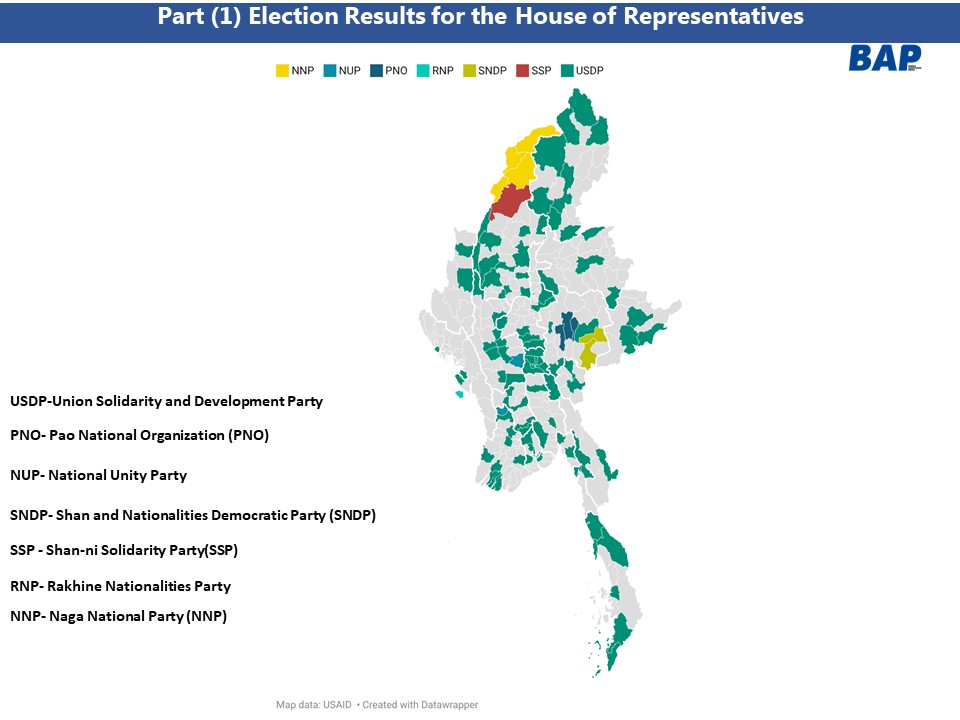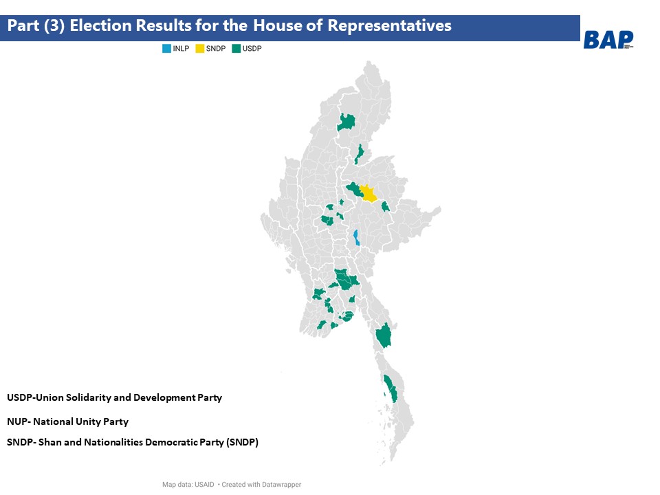 As a result of the first part of the election, the USDP secured 101 seats in the House of Representatives. Following them, the Naga National Party won 4 seats, the Pa-O National Organisation won 3 seats, the Unity and Democracy Party and the Shan Nationalities Democratic Party won 2 seats each, while the Arakan National Party and the Shanni (Tai-Leng) Solidarity Party won 1 seat each.