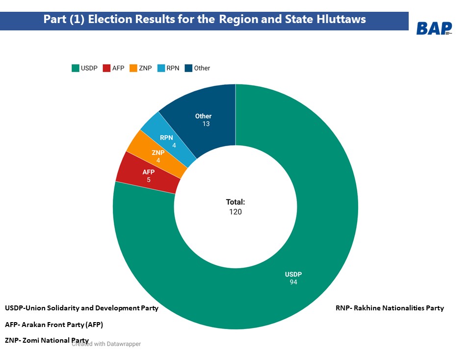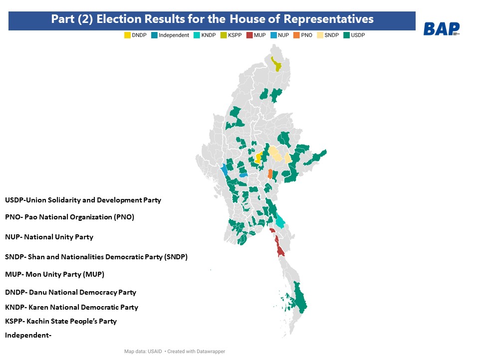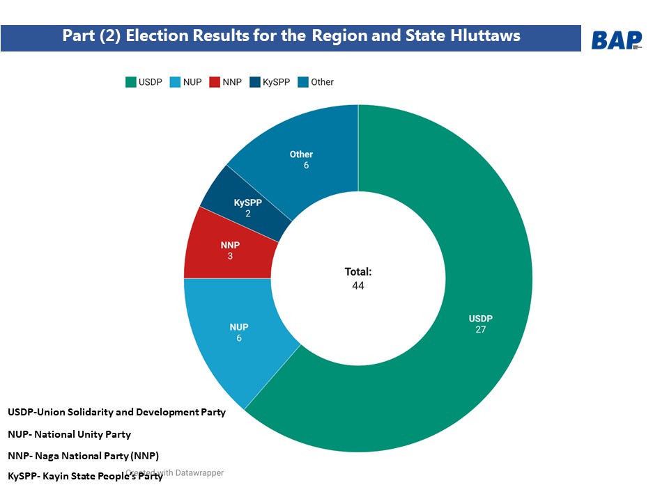 In the Region and State Hluttaw seats for the second part of the election, the USDP won 27 seats, while the remaining parties won 17 seats respectively.