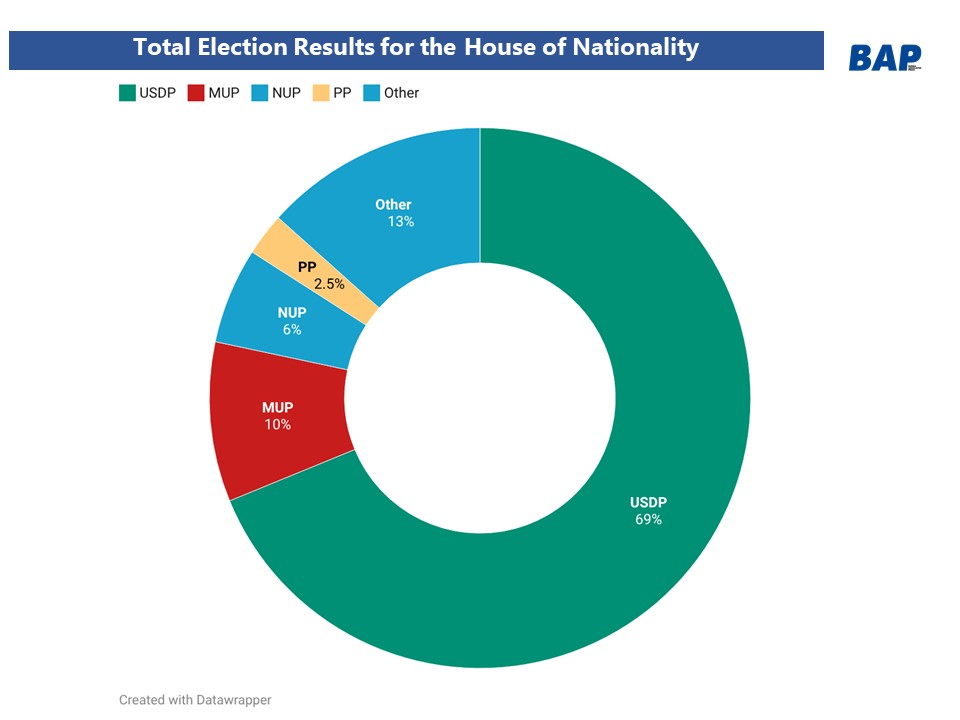 The USDP continued to dominate the House of Nationality as well, securing 56 seats in this round, which brought their total to 108 seats.