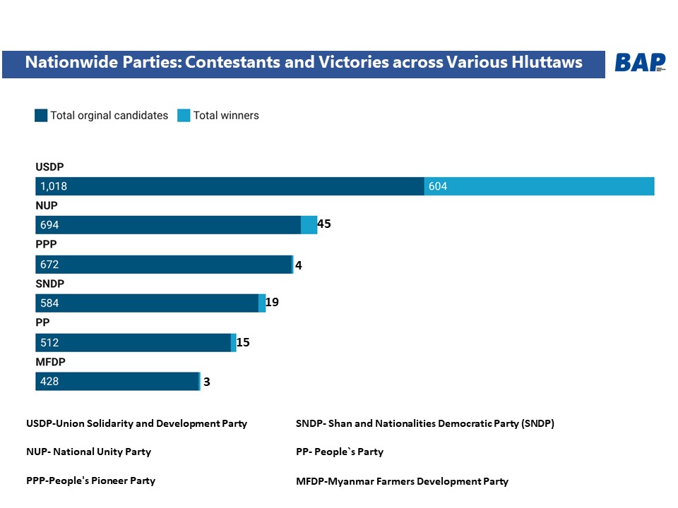 Among the six parties that contested the military group’s election nationwide, the Union Solidarity and Development Party (USDP) won 604 seats out of 1,018 contestants. The National Unity Party (NUP) won 45 seats out of 694 contestants, while the People's Pioneer Party (PPP) won 4 seats out of 672. The Shan Nationalities Democratic Party (White Tiger Party) won 19 seats out of 584, the People's Party won 15 seats out of 512, and the Myanmar Farmers' Development Party won 3 seats out of 428 respectively.