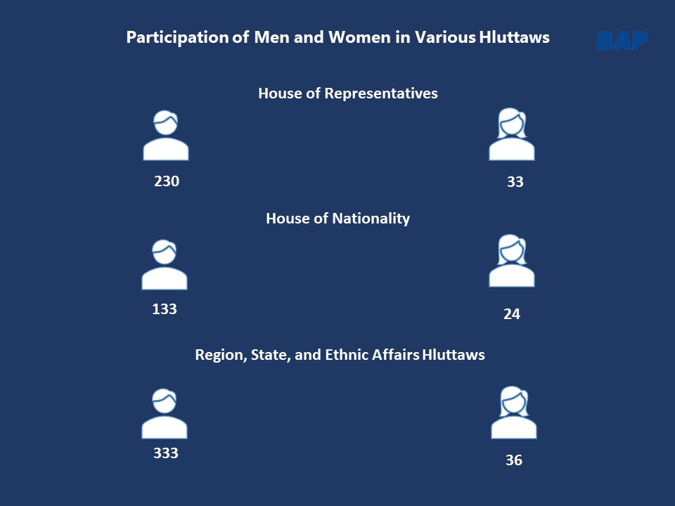 Regarding the participation of men and women in the various houses of the election held by the military group, the House of Representatives includes 230 men and 33 women. In the House of Nationality, there are 133 men and 24 women, while the Region, State, and Ethnic Affairs Hluttaws consist of 333 men and 36 women.