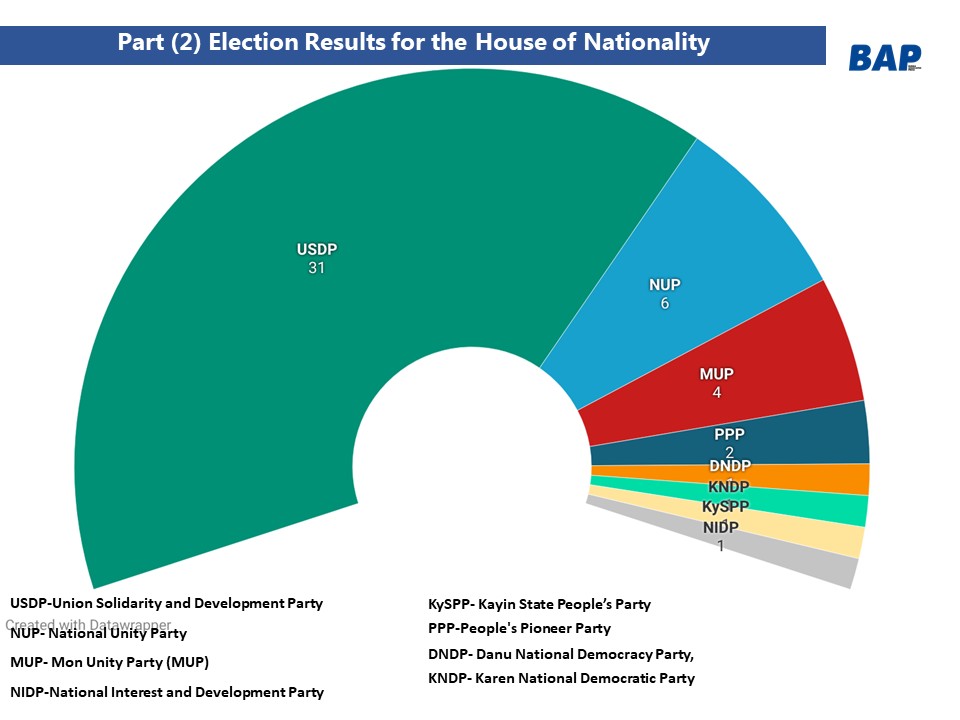 In the House of Nationality, the USDP won 31 seats, the National Unity Party won 6 seats, and the Mon Unity Party won 4 seats. The People's Pioneer Party secured 2 seats, while the Danu Nationalities Democracy Party, the Kayah State People's Party, the Karen National Democratic Party, and the National Interest Development Party won 1 seat each.