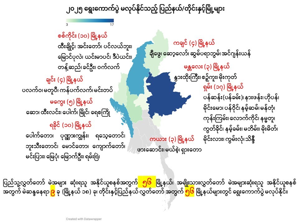 နိုင်ငံတဝှမ်း ရွေးကောက်ပွဲမကျင်းပနိုင်သည့် မြို့နယ် ၅၆ ခုအထိ ရှိနေသည်။