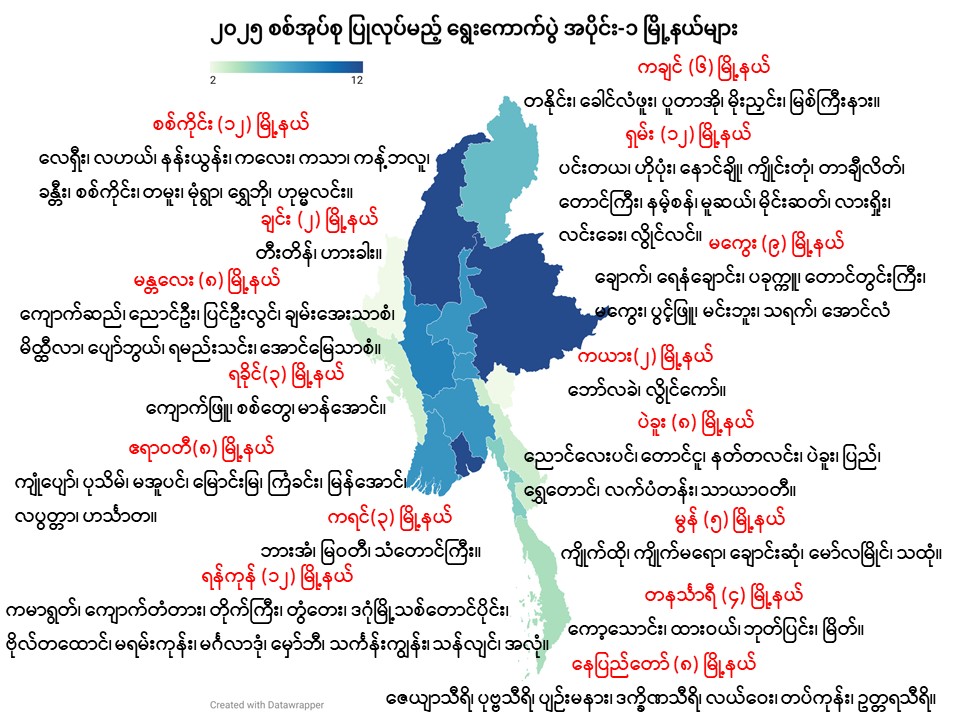 ယင်းတို့အနက် ရှမ်းပြည်နယ်သည် မြို့နယ် ၁၇ ဖြင့် အများဆုံးဖြစ်ကာ၊ စစ်ကိုင်းနှင့် ရခိုင်တွင် ၁၀ မြို့နယ်၊ မကွေးတွင် ၅ မြို့နယ်၊ ကချင်နှင့် ချင်းတွင် ၄ မြို့နယ်၊ မန္တလေးနှင့် ကယား(ကရင်နီ) တွင် ၃ မြို့တို့ဖြစ်သည်။