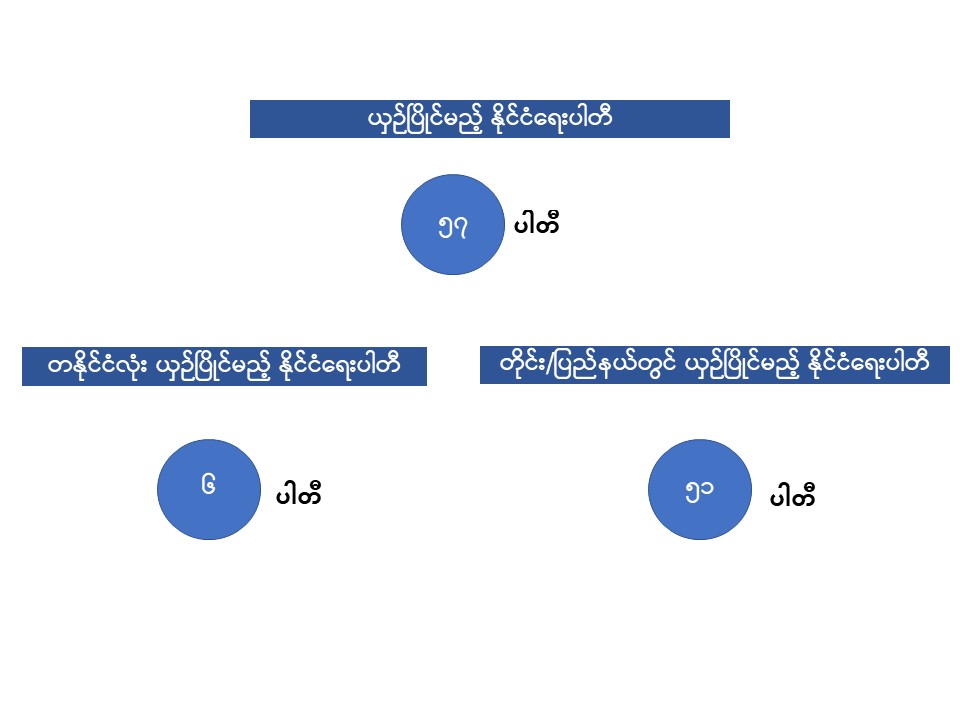 နိုင်ငံရေးပါတီများအနက် တိုင်းနှင့်ပြည်နယ်အတွင်း စည်းရုံးမည့်ပါတီ ၅၁ ခုသည် ကိုယ်စားလှယ်စုစုပေါင်း ၉၄၅ ဦး စာရင်းတင်သွင်းထားပြီး တသီးပုဂ္ဂလပြိုင်မည့်သူက ၉၃ ဦး ရှိနေသည်။