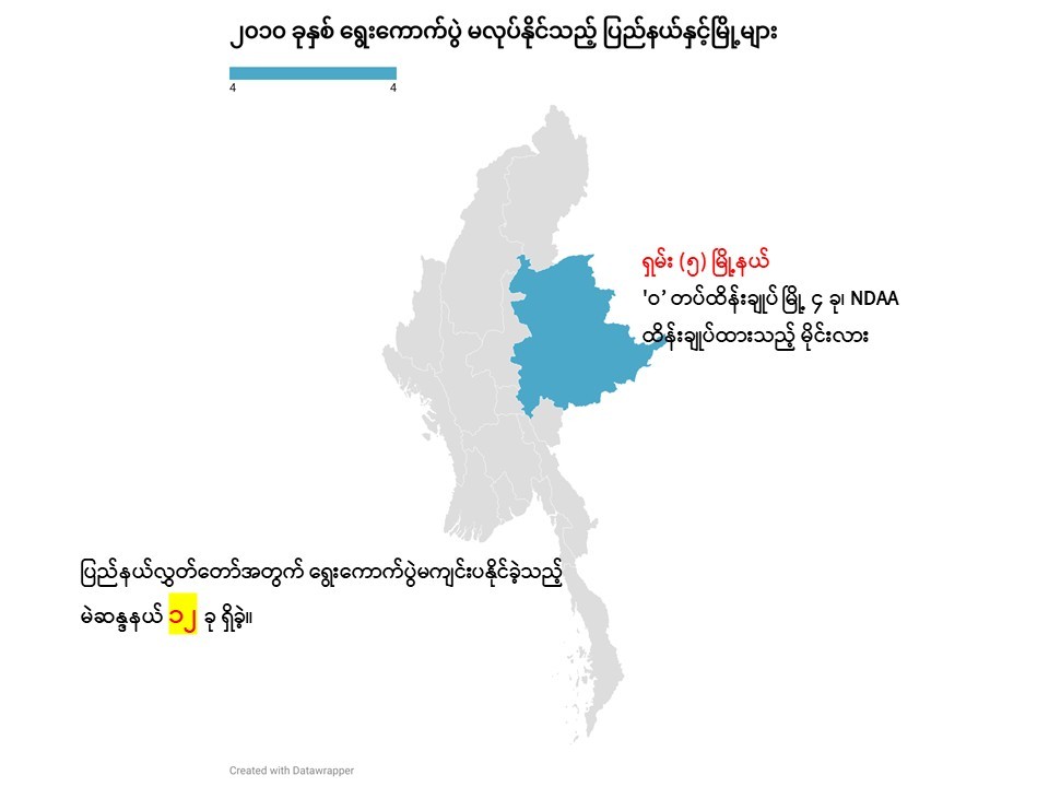 ရှမ်းပြည်နယ်အတွင်းရှိ ‘၀’ သွေးစည်းညီညွတ်ရေးတပ်မတော်-UWSA ထိန်းချုပ်နယ်မြေရှိ မြို့ ၄ ခု (ပန်ဆန်း (ပန်ခမ်း)၊ နားဖန်း၊ ပန်ဝိုင် နှင့် မိုင်းမော) နှင့် အမျိုးသားဒီမိုကရက်တစ် တပ်မတော်- NDAA (မိုင်းလားတပ်ဖွဲ့) ထိန်းချုပ်သည့် မိုင်းလားမြို့နယ်တို့တွင် ရွေးကောက်ပွဲ ၃ ကြိမ်စလုံး ကျင်းပနိုင်ခြင်း မရှိပေ။