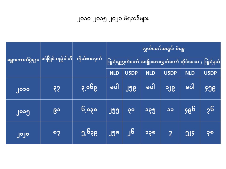 ရွေးကောက်ပွဲ ၃ ကြိမ်တွင် NLD မပါသည့် ရွေးကောက်ပွဲ (၂၀၁၀) မှအပ USDP သည် အစိုးရ ဖွဲ့နိုင်လောက်သည့် မဲမရခဲ့ပေ။