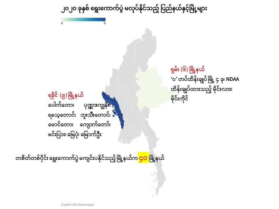 ရွေးကောက်ပွဲ ၃ ကြိမ်အနက် အမျိုသားဒီမိုကရေစီအဖွဲ့ချုပ်အစိုးရလက်ထက် ၂၀၂၀ ရွေးကောက်ပွဲတွင် နယ်မြေမတည်ငြိမ်မှုများကြောင့် မကျင်းပနိုင်သည့် မြို့နယ်များအနေဖြင့် ရှမ်းပြည်နယ်တွင် ၆ မြို့၊ ရခိုင်ပြည်နယ်တွင် ၉ မြို့အထိရှိခဲ့သည်။ တိုက်ပွဲများကြောင့် ရွေးကောက်ပွဲမကျင်းပနိုင်သည့် ရခိုင်ဒေသ မြို့များသည် ၂၀၁၅ ခုနှစ်တွင် ရခိုင်အမျိုးသားပါတီက အနိုင်ရထားသည့်နယ်မြေများဖြစ်သည်။