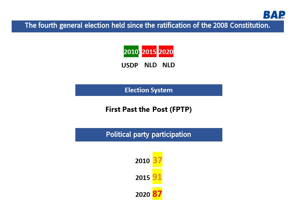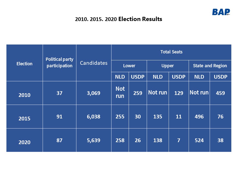 In the three previous elections (2010, 2015, and 2020), the Union Solidarity and Development Party (USDP) won once, while the National League for Democracy (NLD) won twice.