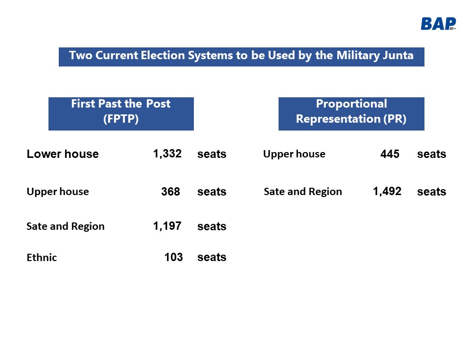Unlike previous elections, the junta will utilize two systems this time: the First Past the Post (FPTP) system and the Proportional Representation (PR) system.