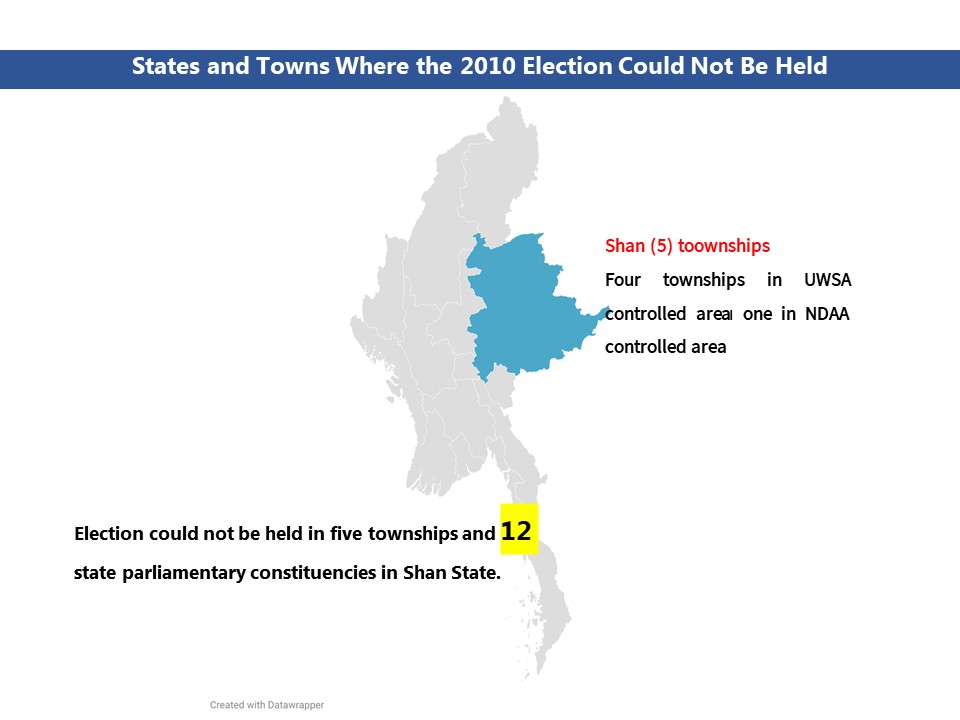 In the 2010 election, election could not be held in five townships and 12 state parliamentary constituencies in Shan State.