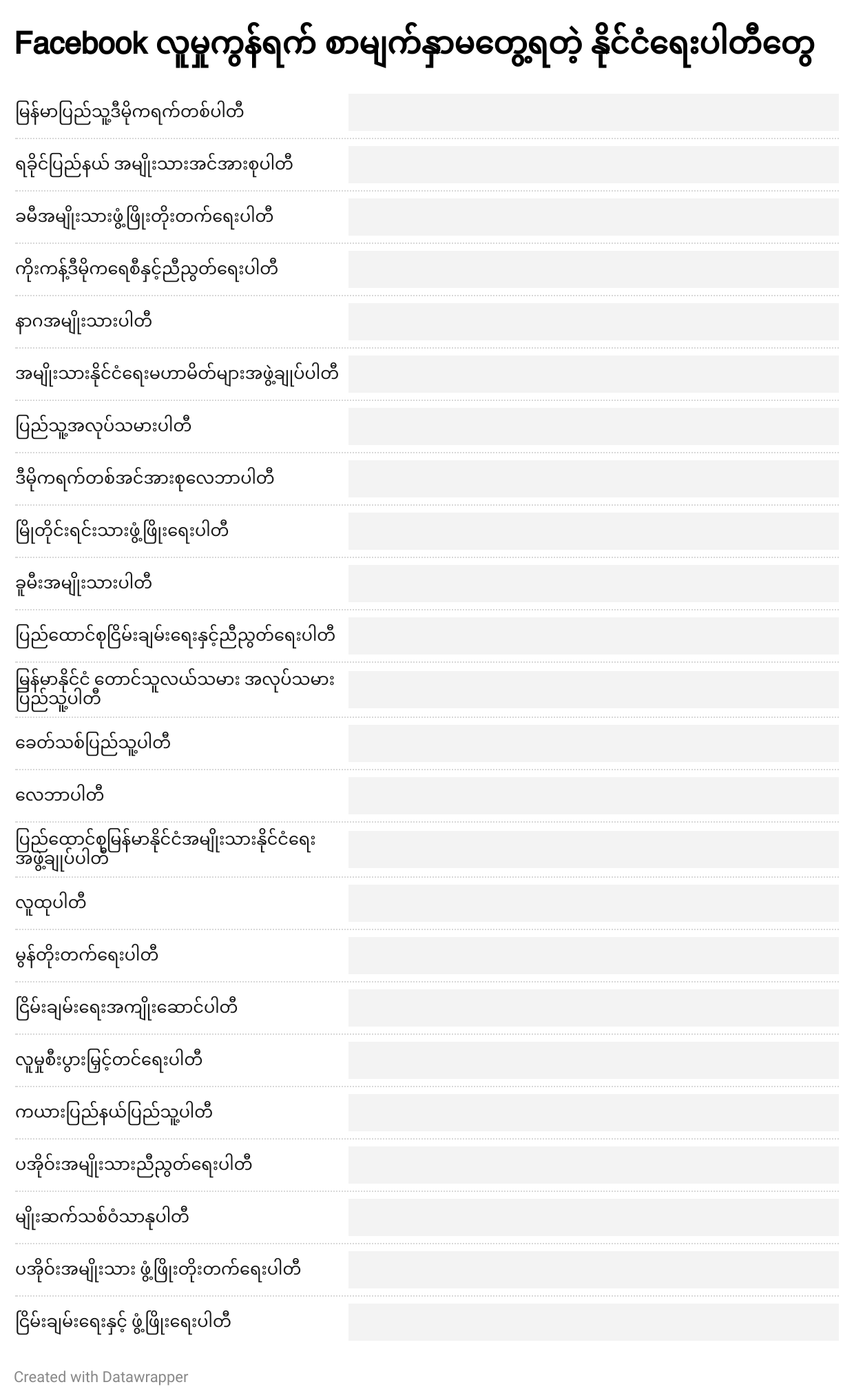 စစ်အုပ်စုရွေးကောက်ပွဲကိုဝင်ပြိုင်ဖို့ရှိတဲ့ နိုင်ငံရေးပါတီ ၅၇ ခုထဲက ထက်ဝက်နီးပါးဖြစ်တဲ့ ၂၄ ပါတီက Facebook လူမှုကွန်ရက်စာမျက်နှာတောင် ရှိမနေပါဘူး။ အများစုက တိုင်းရင်းသားလူမျိုးစုကို အခြေခံတဲ့ ပါတီတွေပါ။