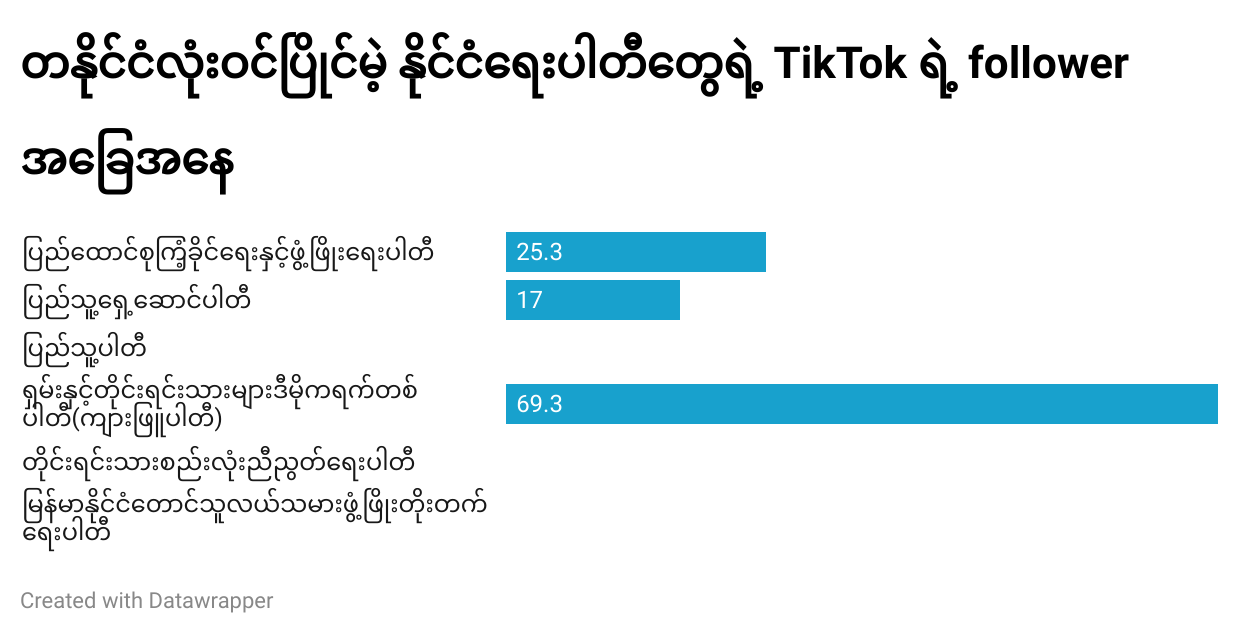 Facebookမှာ follower အများဆုံးဖြစ်တဲ့ ကြံ့ခိုင်ရေးပါတီကတော့ TikTok ပေါ်မှာ follower 25.3K (နှစ်သောင်းငါးထောင်ကျော်) နဲ့ ဒုတိယနေရာမှာသာရှိနေပါတယ်။ ပြည်သူ့ရှေ့ဆောင်ပါတီက follower 17K (တသောင်းခုနှစ်ထောင်) နဲ့ တတိယနေရာမှာပါ။
